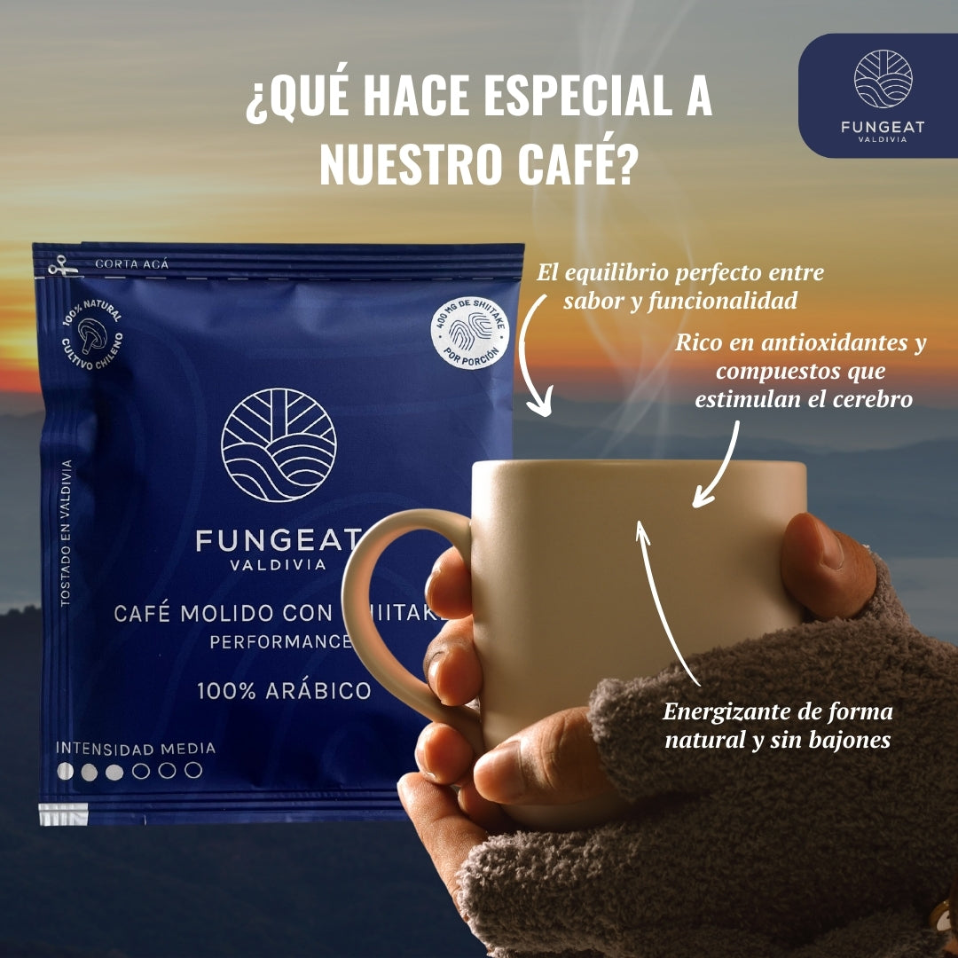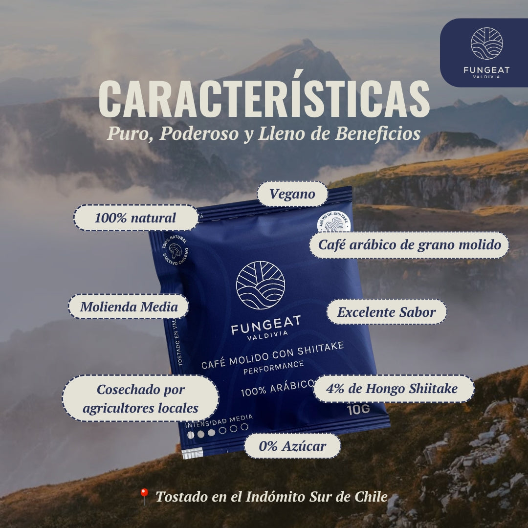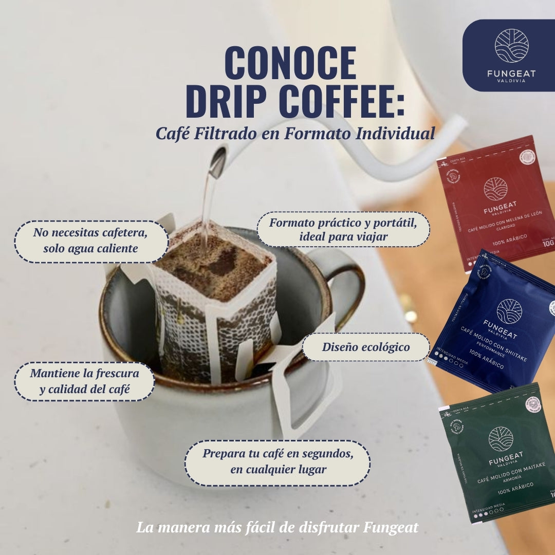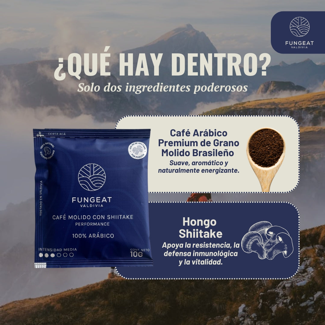 Descubre Drip Performance con Shiitake de Fungeat, una innovadora mezcla que combina el sabor del café de alta calidad con los beneficios del hongo Shiitake (Lentinula edodes). Este drip coffee de 10 gramos está diseñado para potenciar tu día, brindándote energía y apoyo inmunológico en cada taza.